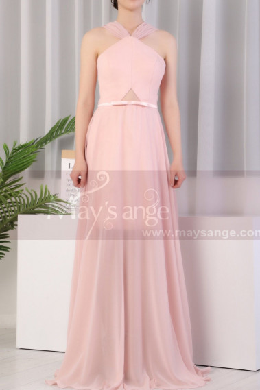 Long Pink Prom Dress Chiffon With Cut Out Top And Waist Belt Formal Evening Dresses For A Wedding