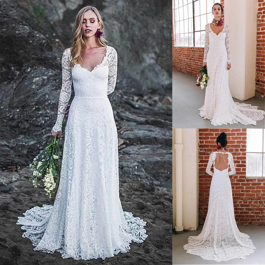 Winsome Lace V Neck Neckline A Line Wedding Dresses Long Sleeves French Wedding Dresses