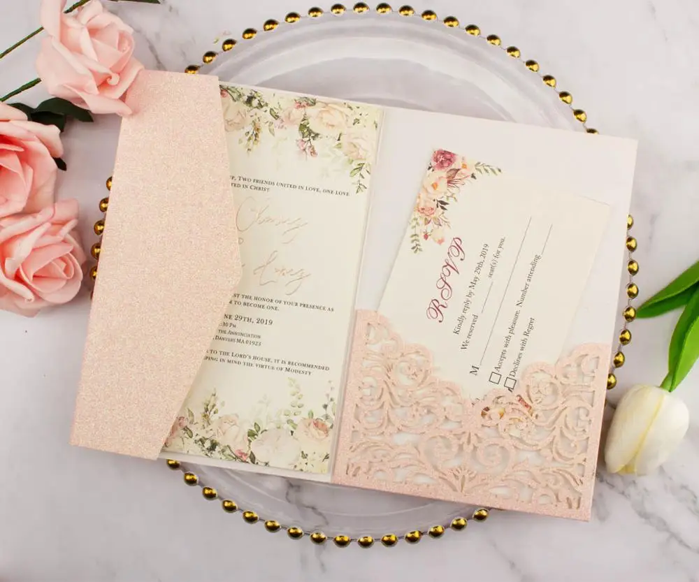 50pcs Pocketfold Laser Cut Glitter Powder Paper Wedding Invitation Gatefold Wedding Invitation