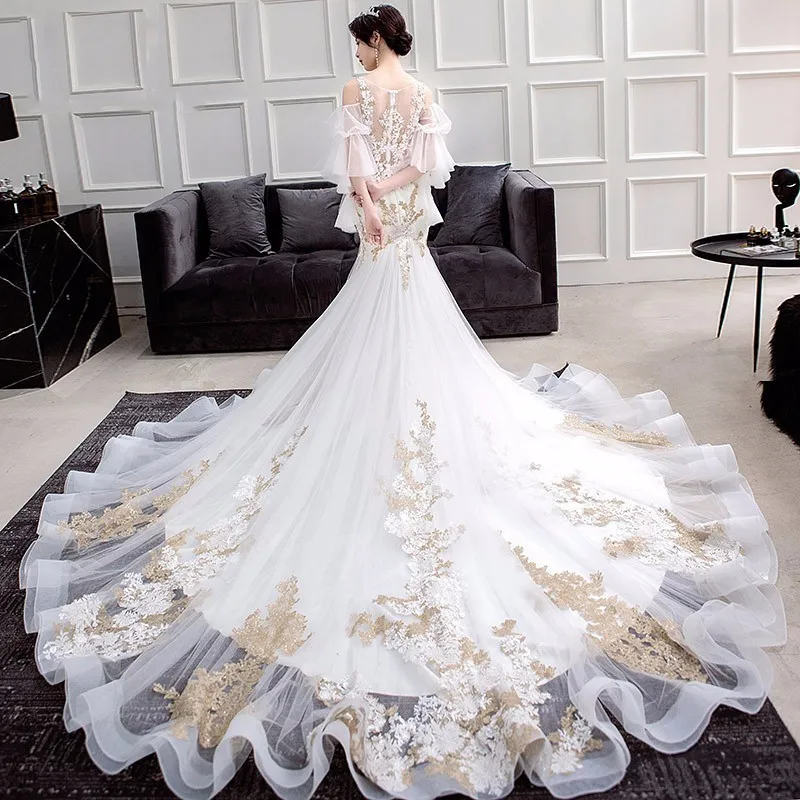 Long Evening Prom Dress Mermaid 2020 Beading Crystal Gold And Gold And White Mermaid Wedding Dress