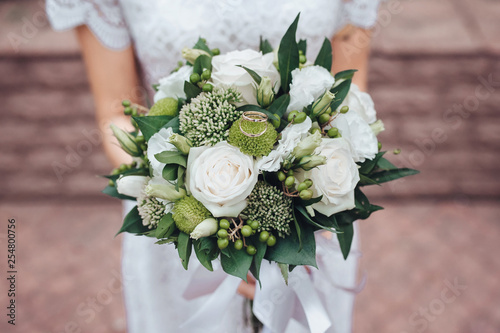 Wedding Bouquet In Bride S Hands White Rose And Gold Rings Close Up Buy This Stock Photo And Explore Similar Images At Adobe Stock Adobe Stock Gold And White Wedding Bouquets