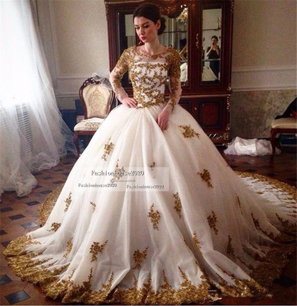 Gold Lace Long Sleeves V Neck Beading Chapel Train Ball Gown Gold Ball Gown Wedding Dresses