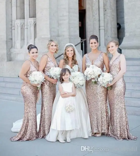 Gold Long Bridesmaid Dresses Sequined 2016 A Line V Neck Floor Gold Bridesmaid Dresses Wedding