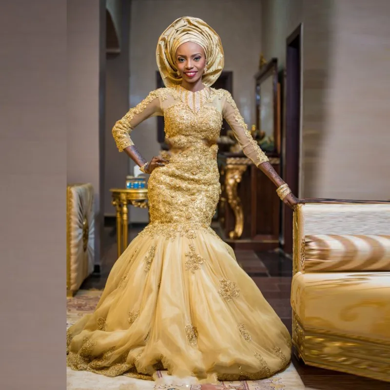 Gorgeous African Gold Wedding Dresses Long Sleeves Mermaid Luxury Gold Wedding Dress Mermaid