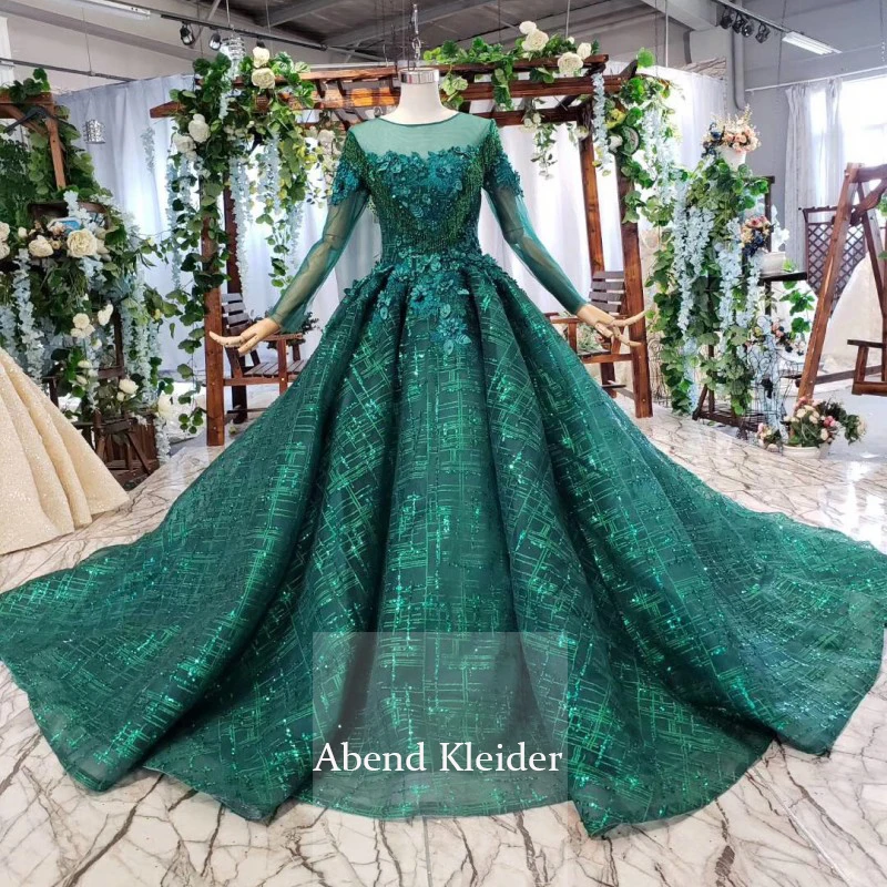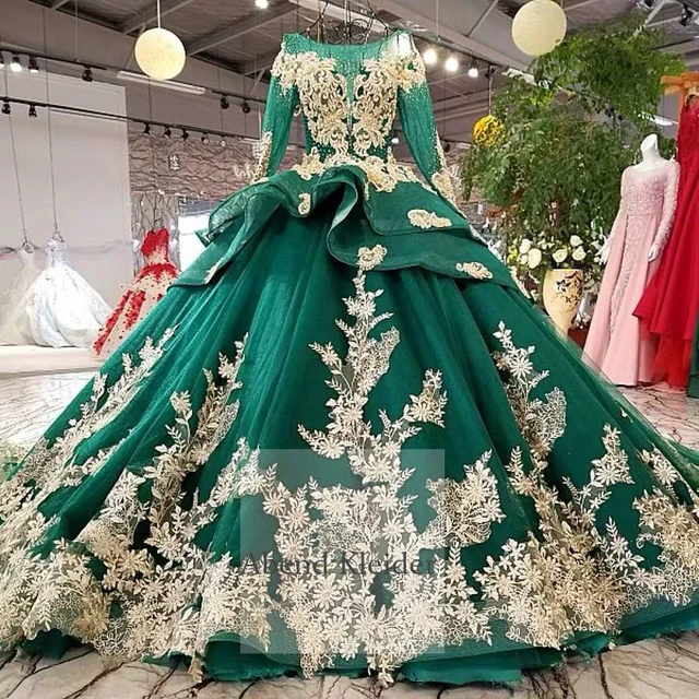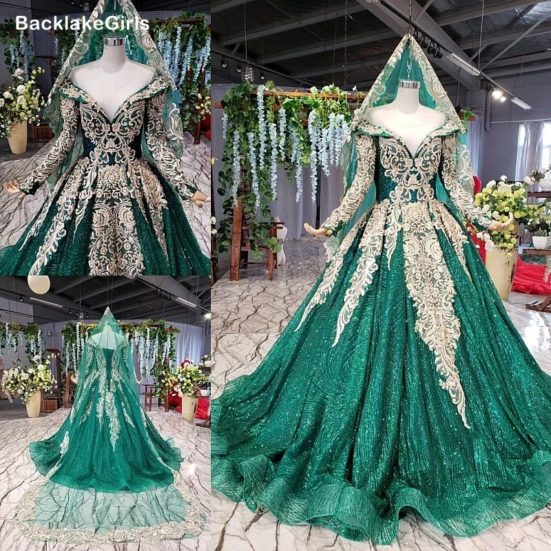 Dark Green Long Sleeves Wedding Dresses 2020 Appliques Lace V Neck Green Wedding Dresses 2020