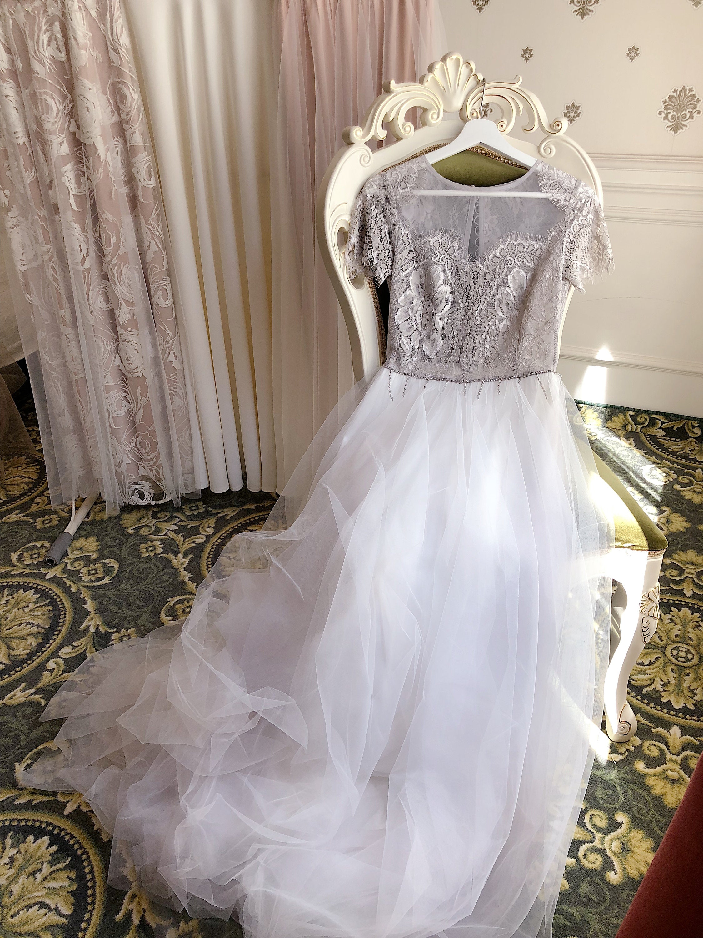 Stunning Grey Ball Gown Wedding Dress With Black Floral Lace Grey Wedding Dress Long Sleeve
