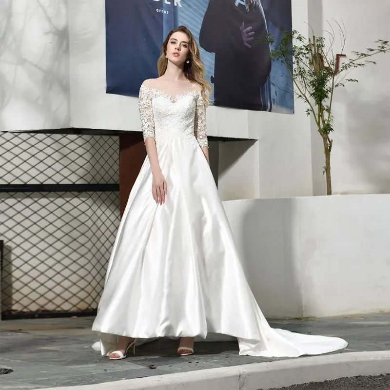 Fashion Romantic Half Sleeves Off Shoulder Lace Wedding Dresses Half Lace Wedding Dress