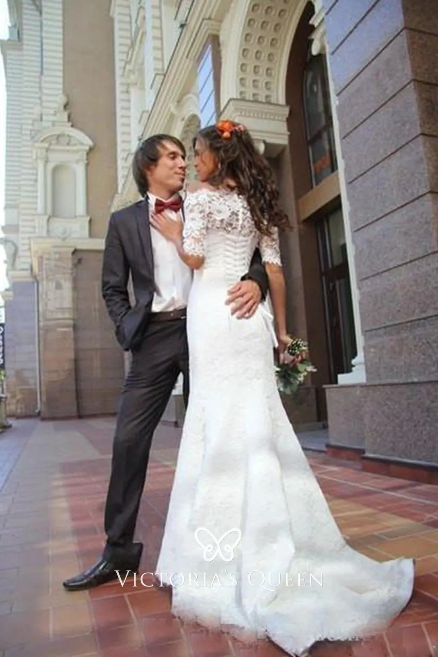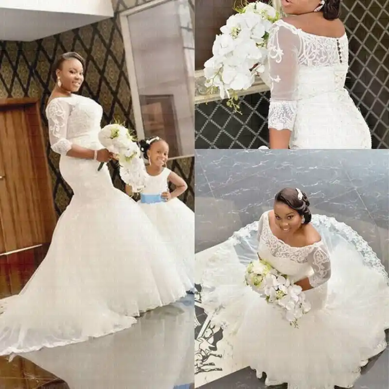 White Off The Shoulder Lace Mermaid Wedding Dress With Half Half Sleeve Mermaid Wedding Dress