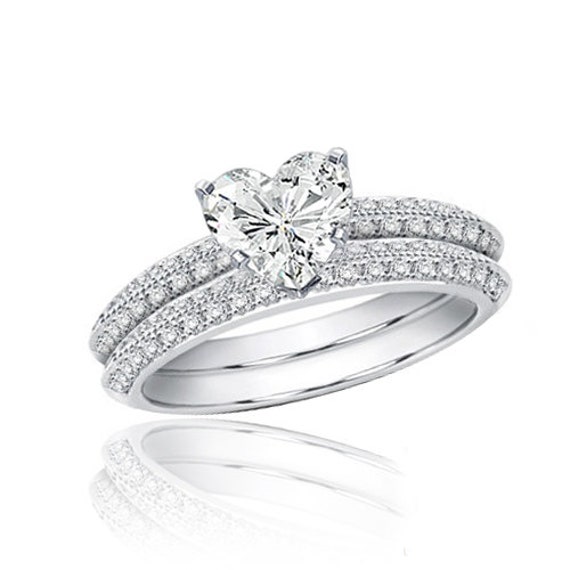 14kt White Gold Heart Diamond Bridal Wedding Engagement Ring Band Heart Diamond Wedding Ring Set