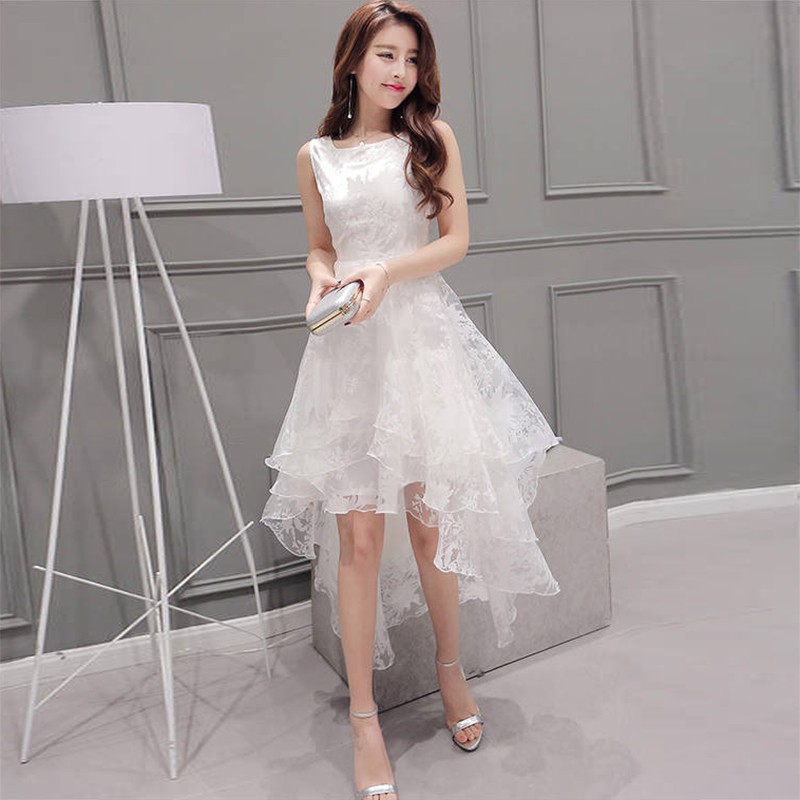 Summer Maxi Dress Women O Neck Sleeveless Sweet Ball Gown White High Low Ball Gown Wedding Dress