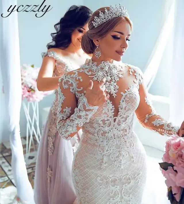 Mermaid Full Sleeve High Neck Lace Button Wedding Dresses High Neck Lace Fishtail Wedding Dress