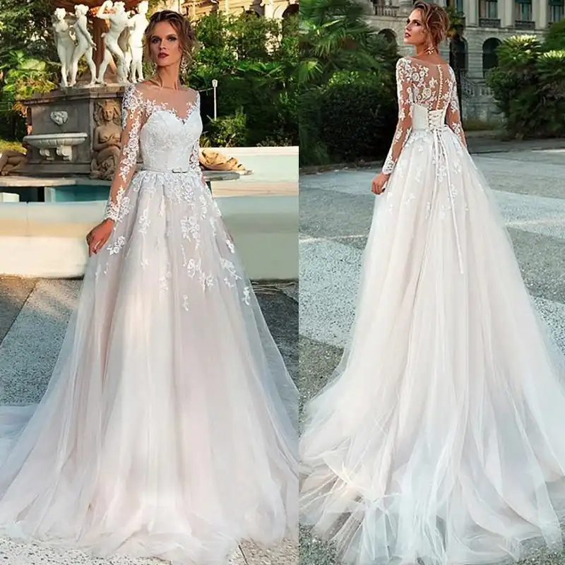 Vestidos De Novia Luxury Lace Wedding Dress Illusion Long Sleeve Illusion Back Wedding Dress With Buttons