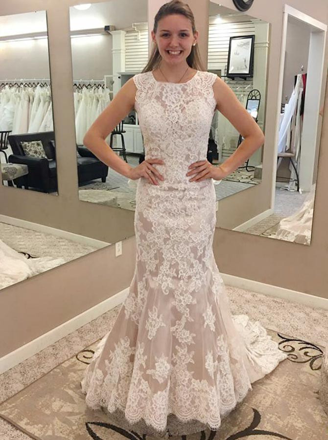 Appliques Illusion Back Lace Mermaid Round Neck Wedding Dress Illusion Back Wedding Dress