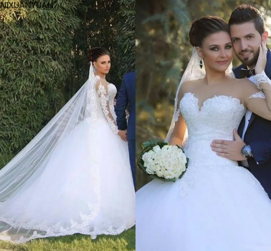 Illusion Sleeve White Lace Satin Elegant Wedding Gown Vq Illusion Neckline Long Sleeve Lace Ball Gown Wedding Dress
