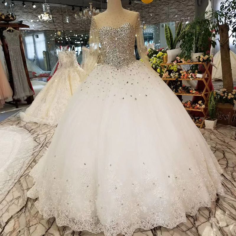 Ball Gown Illusion Neckline See Through Tulle Long Sleeve Corset Wedding Dress With Crystals Illusion Neckline Long Sleeve Lace Ball Gown Wedding Dress