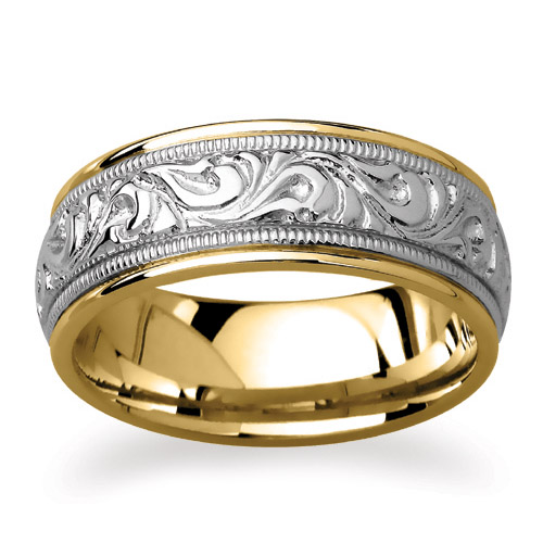 14k Yellow And White Gold Hand Carved Wedding Ring 8mm Gr66o8yw Groom S Ring Inexpensive White Gold Wedding Bands