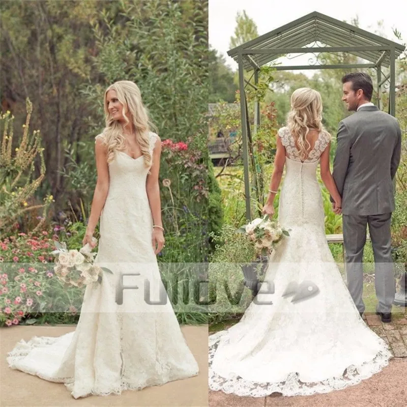 Romantic Ivory Lace Mermaid Princess Wedding Dresses Slim Cut Cap Ivory Lace Cap Sleeve Wedding Dress