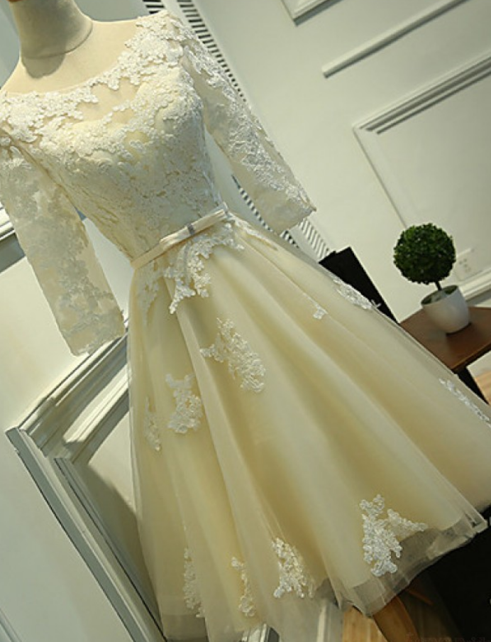 Long Sleeve Ivory Lace Tea Length Illusion Bridal Dress Vq Ivory Tea Length Wedding Dress With Sleeves