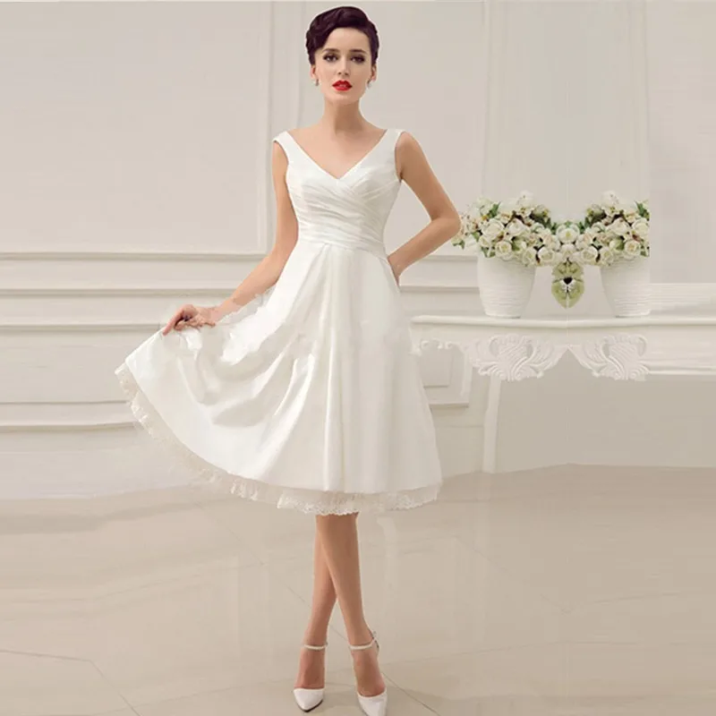 V Neck Backless Pleated Satin Short Wedding Dress Lace Up Vestido Ivory Wedding Dress Meaning