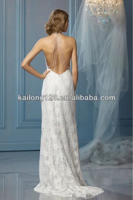 Sexy Spaghetti Straps Jeweled Beads Open Back Sheath Sweep Train Jeweled Back Wedding Dress