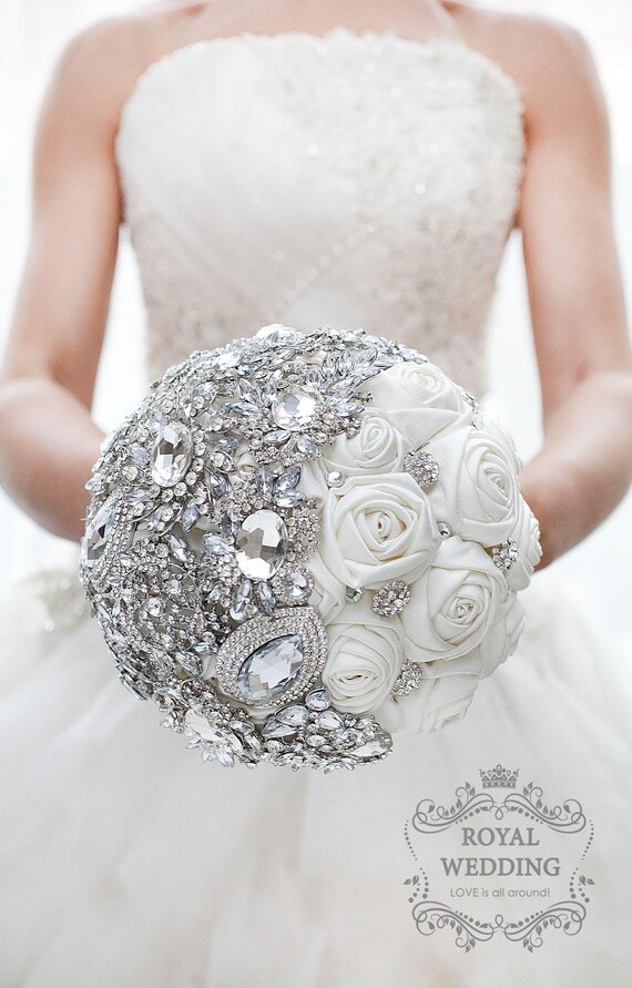 White Fabric Wedding Brooch Bouquet Ivory Silver Bridal Etsy Jewelry For Ivory Wedding Dress