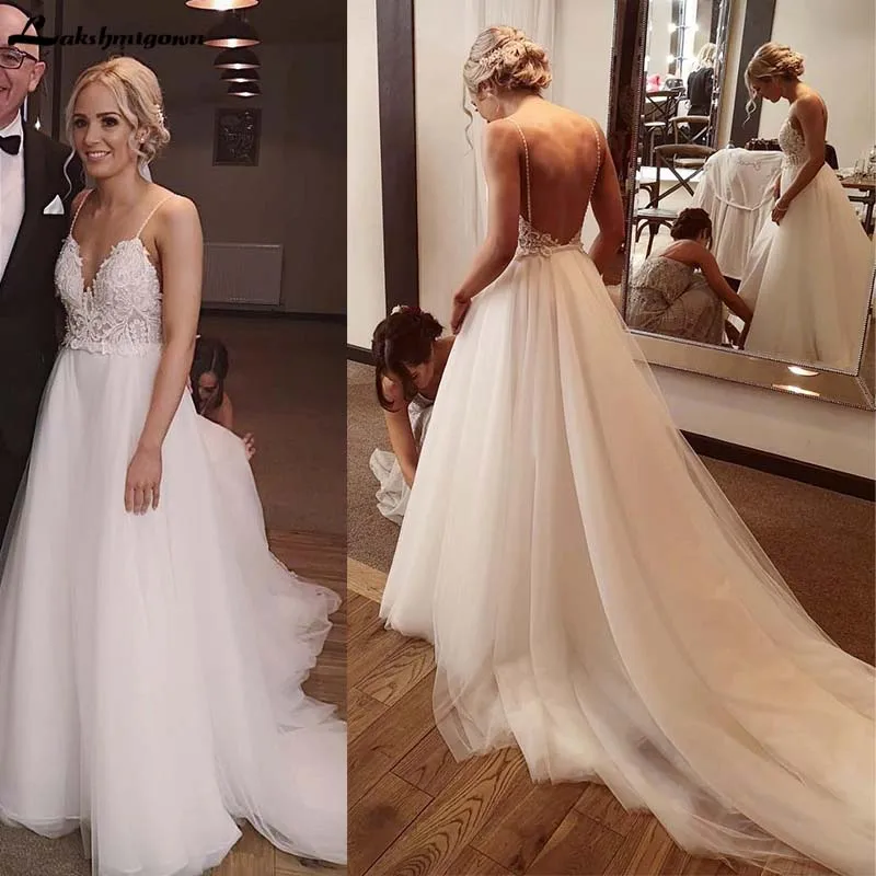 White A Line Lace Wedding Dress Sexy V Neck Open Back Spaghetti Lace A Line Open Back Wedding Dresses
