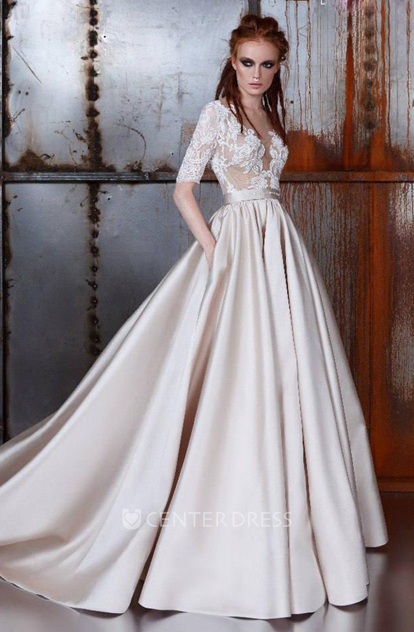 Lace Half Sleeve Satin A Line Wedding Dress With Illusion Lace And Satin Wedding Dress