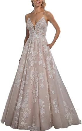 Spaghetti Straps Beach Wedding Dress V Neck Lace Backless Chapel Train Bride Gown For 2019 Plus Size Ivory At Amazon Women S Clothing Store Lace Backless Beach Wedding Dress