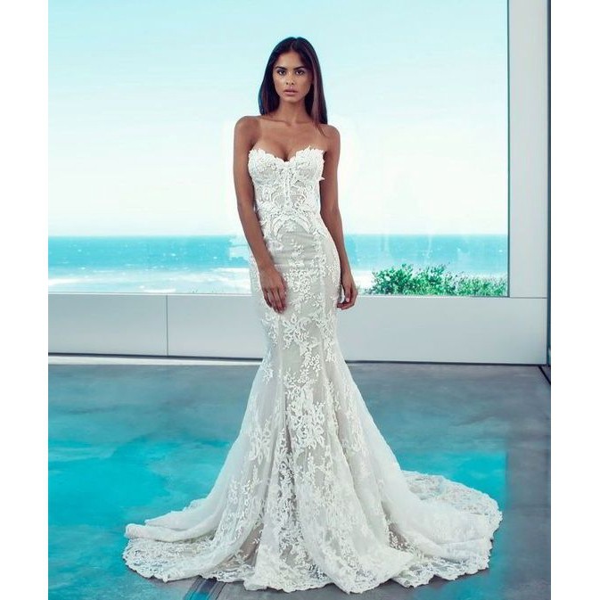 Cheap Elegant Lace Spaghetti Straps Backless Mermaid Wedding Dress Lace Backless Wedding Dress