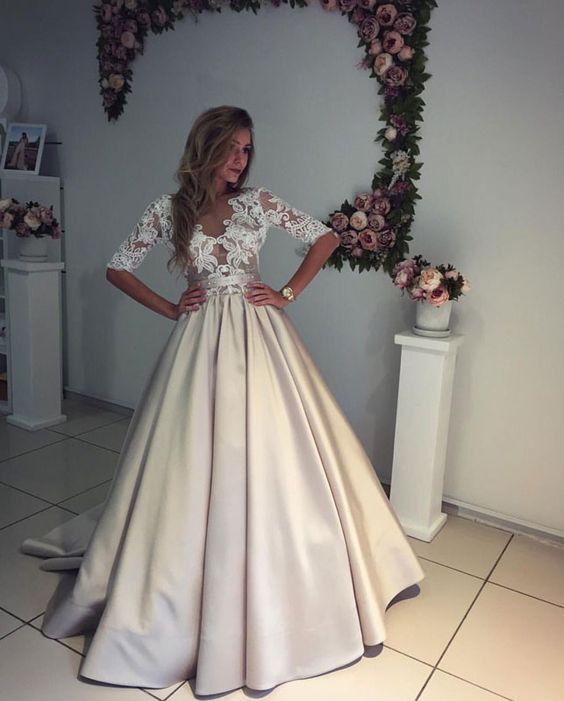 Half Sleeve Satin Skirt Lace Bodice Modern Wedding Dress Formal Lace Bodice Satin Skirt Wedding Dress