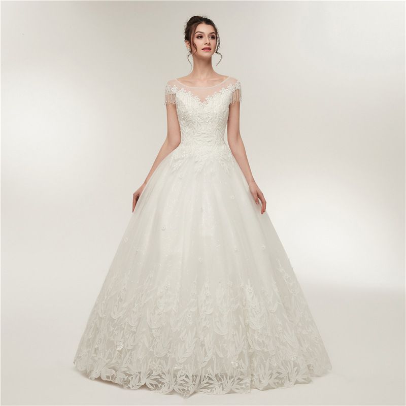 Discount Sheer Neck Ivory Wedding Dresses 2019 Lace Appliqued Cap Lace Cap Sleeve Wedding Dress Keyhole Back