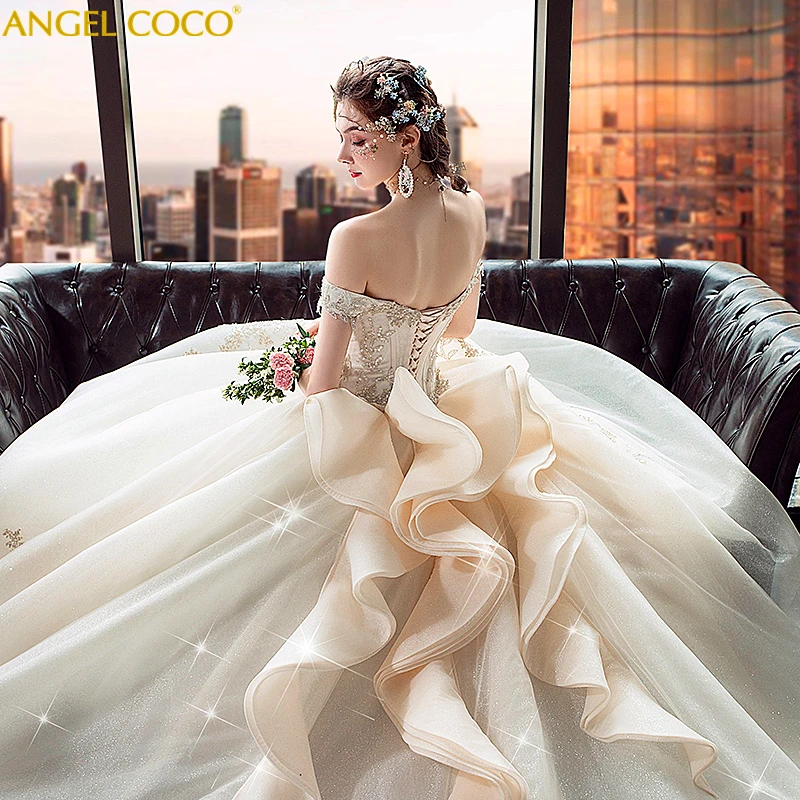 A Line Tulle Wedding Gown With Gold Lace Appliques Rdevine Lace Champagne Gold Wedding Dress