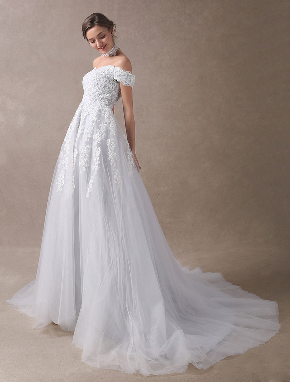 Colored Wedding Dresses Off Shoulder Bridal Dress Choker Lace Applique Tulle Light Grey Wedding Gowns With Train Milanoo Com Lace Colored Wedding Dresses