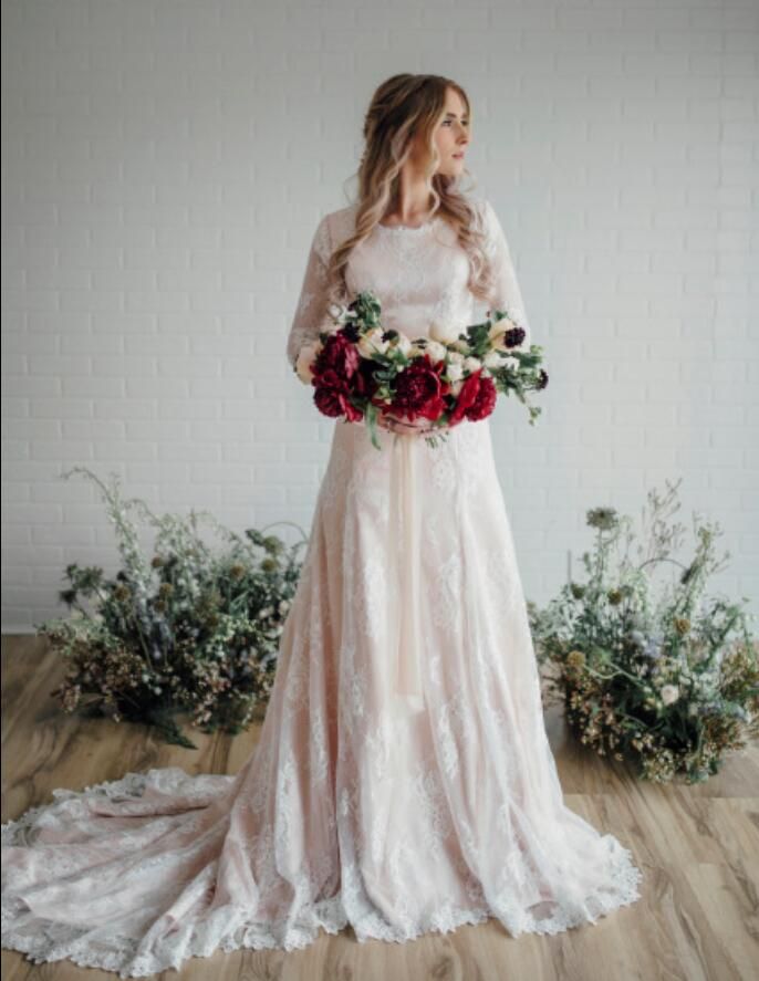 Pink Mermaid Lace Modest Wedding Dresses With Long Sleeves Jewel Lace Conservative Wedding Dresses