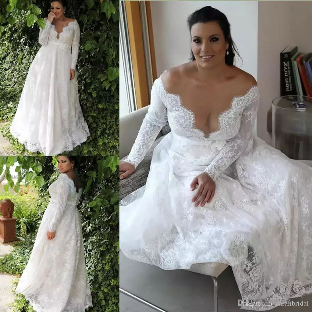 Discount Plus Size Wedding Dresses With Half Sleeves Sheer Jewel Lace Empire Waist Plus Size Wedding Dresses