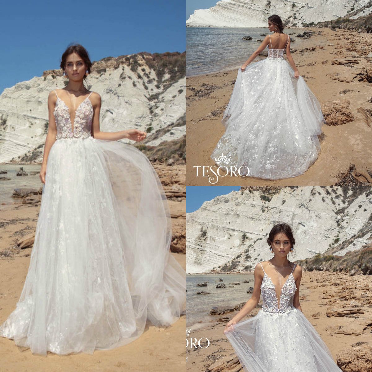 Discount 2019 Beach Wedding Dresses Spaghetti Lace 3d Floral Appliqued Sweep Train Custom Made Flowing Bridal Gowns Boho Bohemian Wedding Dress Casual Wedding Dress Lace Flowing Wedding Dresses