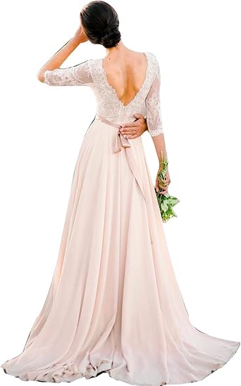 Nemobridal V Neck Boho Half Sleeve Wedding Dresses Lace Backless Lace Half Sleeve Wedding Dress