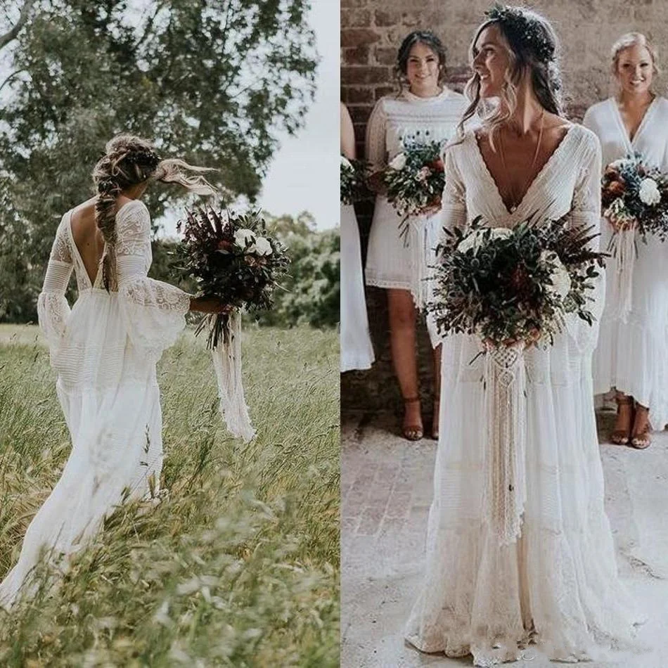 Handmade Bell Sleeve Crochet Lace Bohemian Wedding Dress Off Lace Hippy Wedding Dress