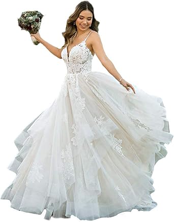 Amazon Com Megan Women S Ball Gowns Spaghetti V Neck Tulle Lace Lace Layered Wedding Dress