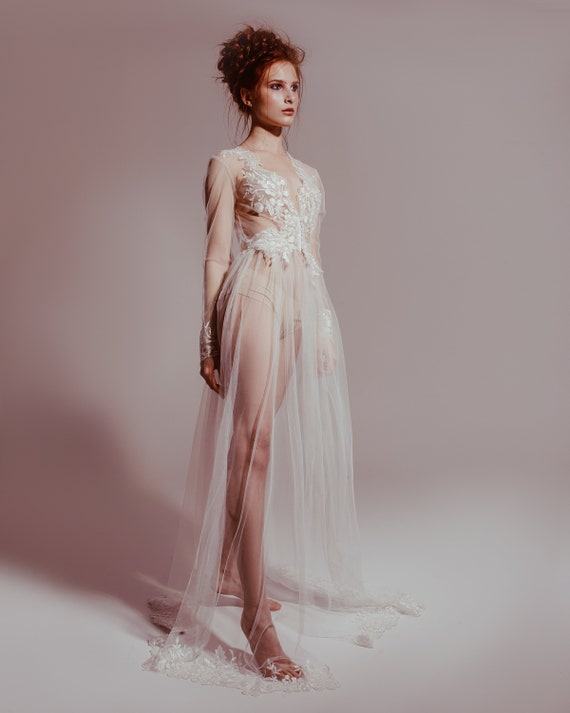 Boudoir Dress Bridal Lace Gown Bridal Tulle Robe Etsy Lace Long Beach Wedding Dresses