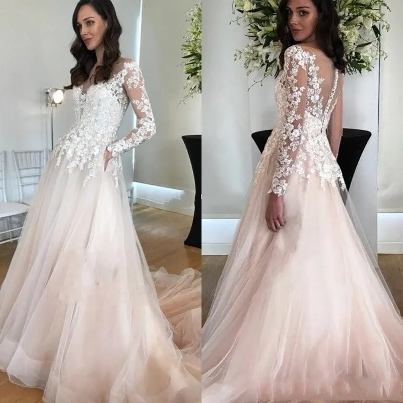 2020 Elegant Blush Pink Lace Long Sleeves Wedding Dresses Beach Lace Long Sleeve Lace Blush Wedding Dress