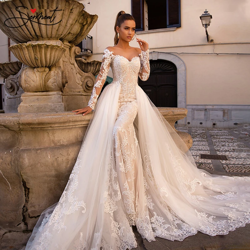 China New Long Sleeves Boat Neckline Sheath Lace Mermaid Wedding Lace Long Sleeve Mermaid Tail Wedding Dress