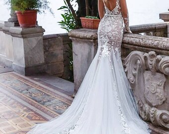 V Neck Cheap Mermaid Trumpet Wedding Dresses With Sleeves Bridelily Lace Mermaid Trumpet Wedding Dress