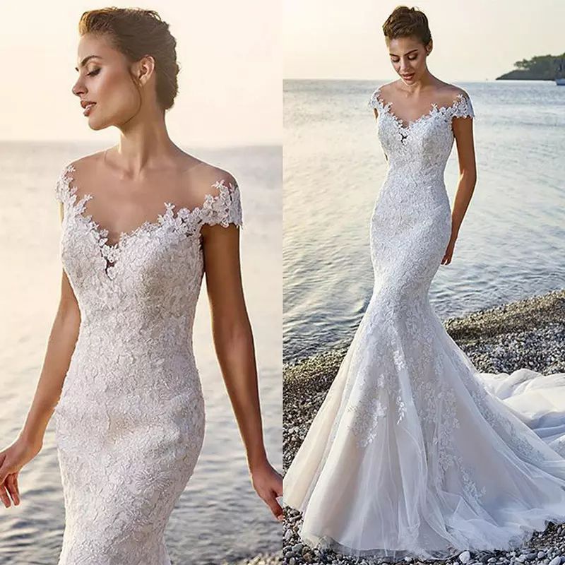Applique Cap Sleeve V Neck Mermaid Wedding Dress With Illusion Lace Mermaid Wedding Dress With Cap Sleeves