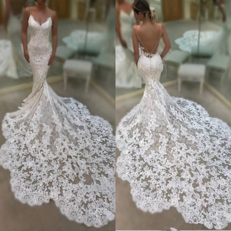 Sleeveless Lace Mermaid Wedding Dress Detachable Train Backless Lace Mermaid Wedding Dresses With Long Train