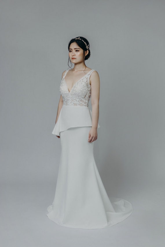 Modern Asymmetrical Peplum Wedding Dress With Deep V Etsy Lace Peplum Wedding Dress