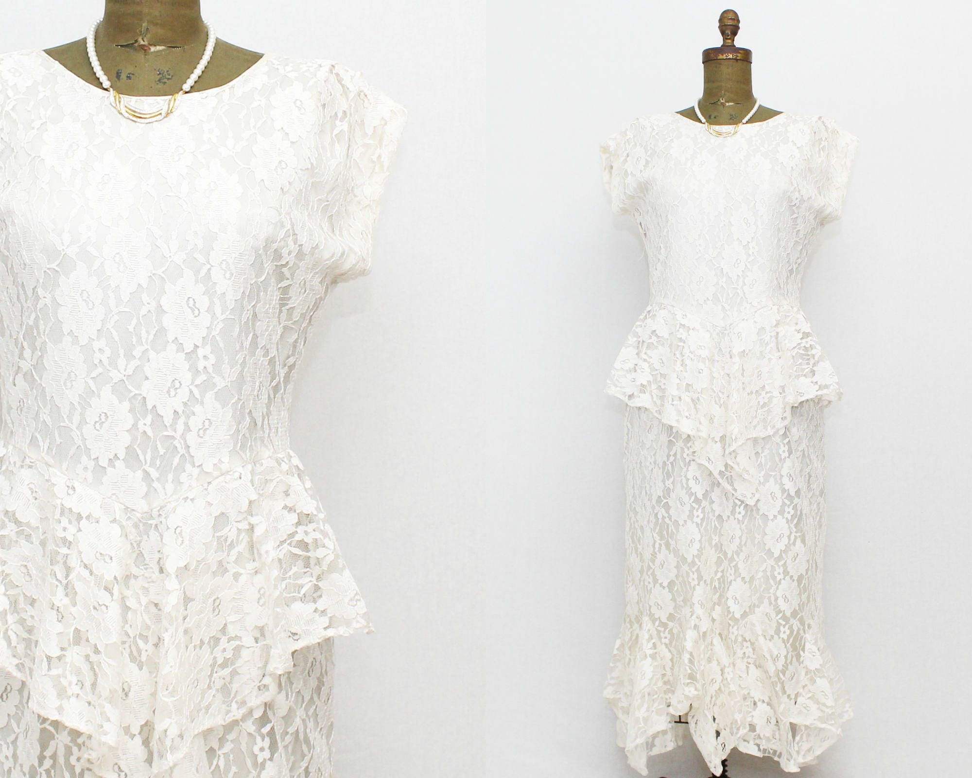 Lace Peplum Wedding Dress Size Large Vintage 1980s Off White Lace Peplum Wedding Dress
