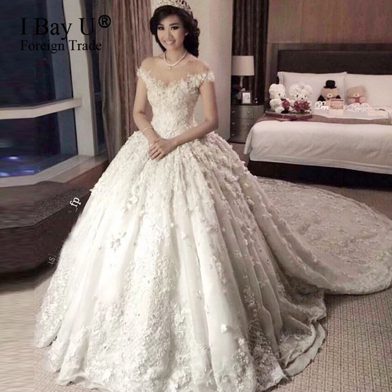 Wedding Dresses 2020 Luxury Sheer Neck Applique Lace Pleated Ball Lace Pleated Wedding Dress