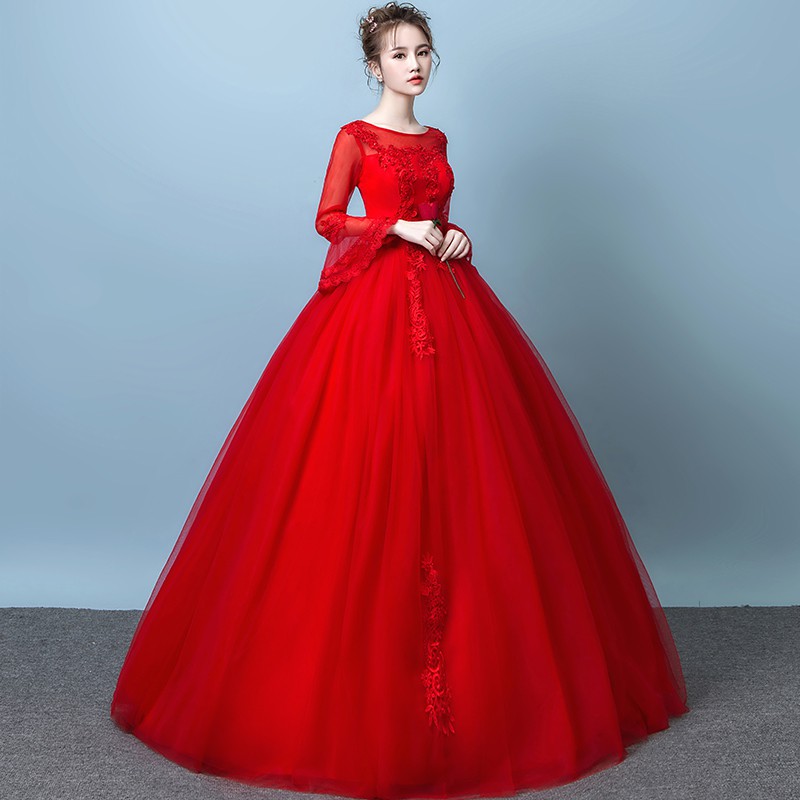 Red Wedding Dresses 2019 Long Sleeve Satin Princess Ball Gown Lace Red Wedding Dresses With Sleeves