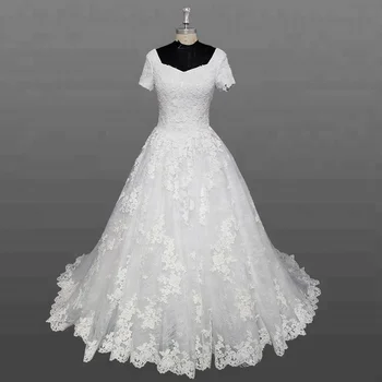 Short Sleeve High Neck Ivory Lace Long Wedding Dress Vq Lace Short Sleeve Wedding Dresses